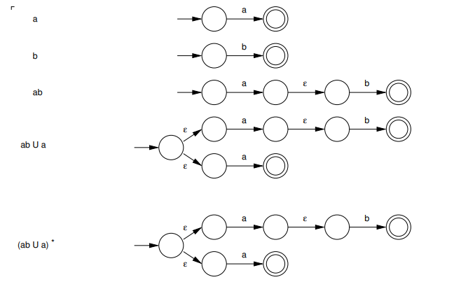 we use each rule defined at the start one by one, to build an nfa from regular expressions. for example: